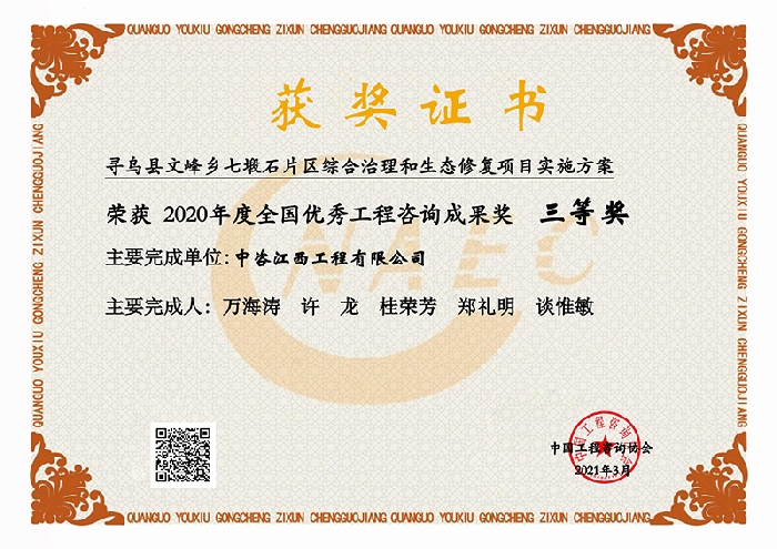 获奖证书 寻乌县文峰乡七墩石片区综合治理和生态修复项目实施方案